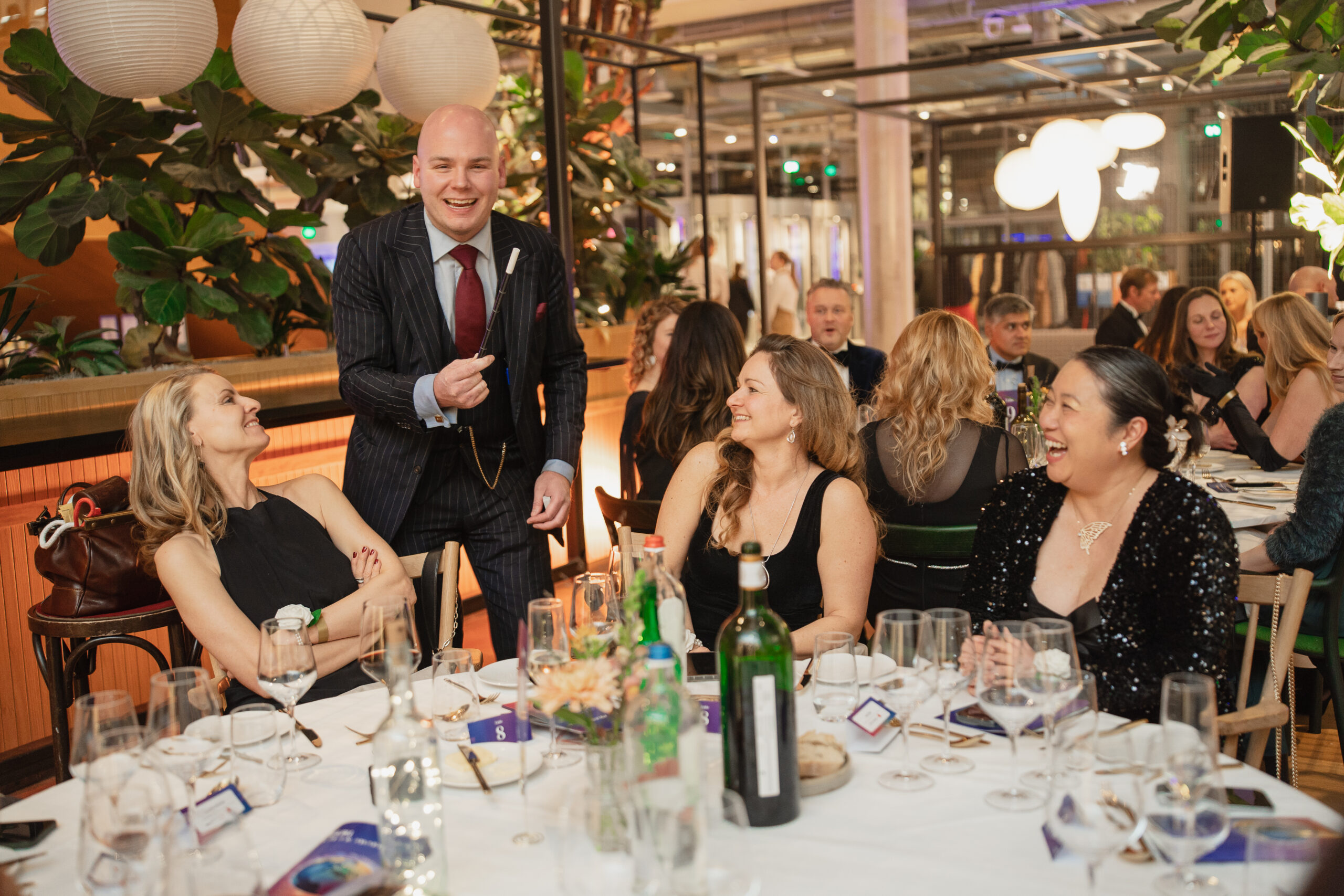 The idea of an invisible thread for the evening became wonderfully literal during dinner. Much to the amazement of guests, Michel van Zeist, one of Amsterdam’s most in-demand magicians, pulled a seemingly endless length of tape from his mouth. As the tape continued to weave its way across the entire length of the dining area, dangling over bemused guests’ heads, tables that had been deep in conversation over beef bourguignon and Chateau de Velvet wine looked up in unison.